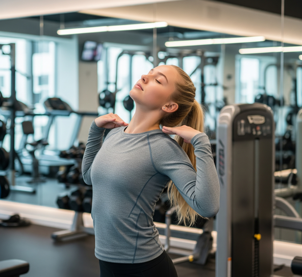 Gently tilting your head backward to stretch the front neck muscles, perfect for counteracting "tech neck" from phone/computer use.